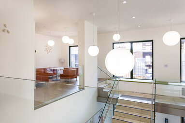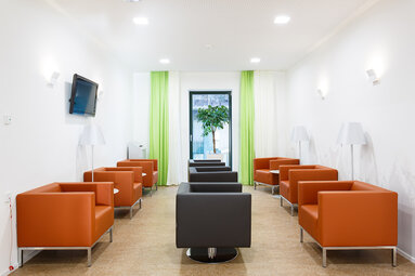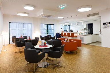 In den Pausen bieten sich verschiedene Aufenthaltsmöglichkeiten im Foyer und auch kleine "Rückzugs-Nischen" in unserem Therapiebereich an. In den wärmeren Monaten lädt das Messequartier auch outdoor mit einigen Verweilmöglichkeiten zur Pausengestaltung ein.